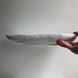 White glazed over a rustic white clay body. Individually imprinted with hand carved stamped Australian native flowers and leaves. Organically edged and so pretty with the grounding earthiness of the grainy clay.