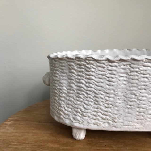 Imprinted with seagrass basketweave design. White gloss glaze over a pale clay body.