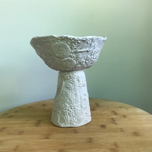 This gorgeous floral encrusted chalice planter is made from a rough clay body , and stamped and carved with beautiful Australian Native flowers. It is covered with a glossy white glaze and is designed for presenting special plants in a dramatic way. Perfect for plants that drape.